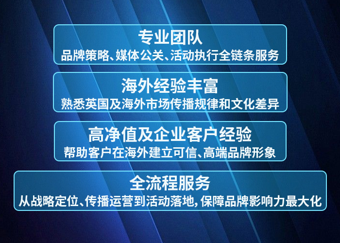为计划进入英国及其他海外市场的企业,提供全方位品牌建设与公关落地服务。帮助企业快速建立海外影响力、提升品牌声誉,实现市场认可与业务增长。