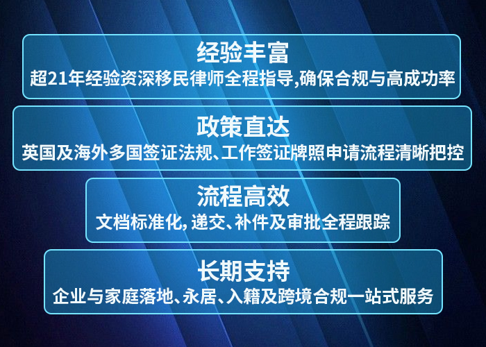 *合规要点:遵循英国内政部(UK Home Office)签证政策及OISC注册规范,确保所有申请合法合规,降低拒签及延误风险。